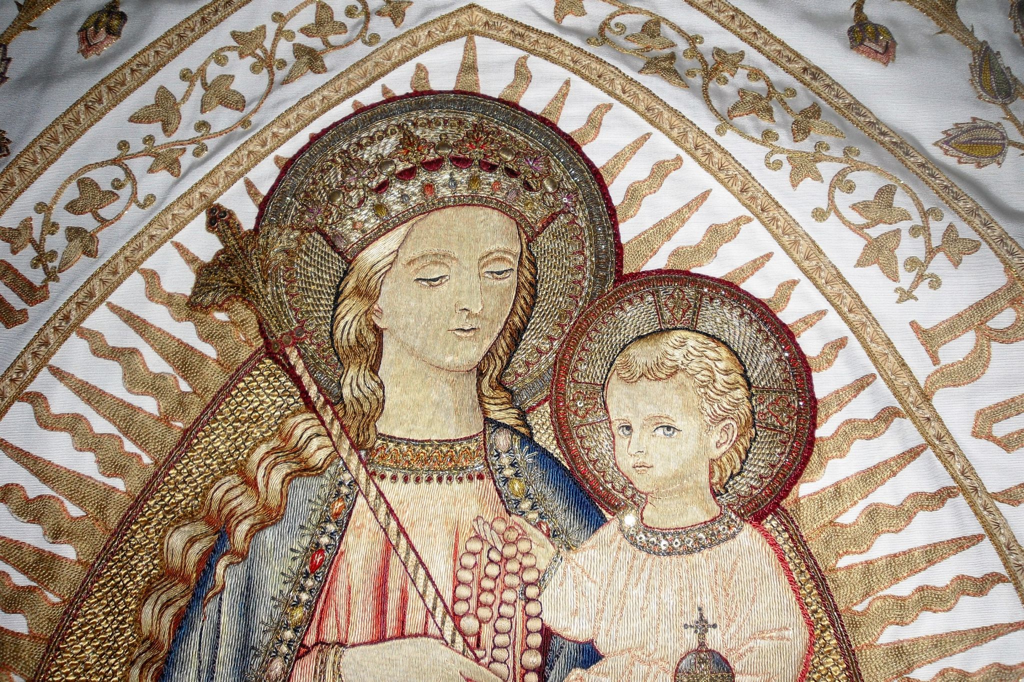 Im „Kirchenschatz“ unserer Stadtpfarrkirche gibt es eine neugotische Marienfahne! Das Foto zeigt einen Ausschnitt. Ich kann mich an diesem gestickten Bild nicht sattsehen! Aus tausenden von kleinen Stichen, entsteht ein kunstvolles Bild der Gottesmutter mit dem Jesuskind. Die Kirche feiert am 1. Jänner, egal in welchem Kalenderjahr, das Hochfest der Gottesmutter Maria und stellt sie uns sozusagen als „barmherzige Pförtnerin“ an die Türschwelle des neues Jahres Zweitausendachtzehn! Ich werde diese Fahne heuer wieder ganz bewusst in unserem Altarraum aufstellen, um uns an diese Glaubenstatsache zu erinnern, dass Maria und Jesus jeden Tagen des (neuen) Jahres, treu uns still an unserer Seite gehen werden. Wer das einmal wirklich kapiert hat, dem geht der Segen nie aus! Meinen treuen Blogleser-Innen wünsche ich ein gutes neues Jahr 2018, vor allem viel Zufriedenheit und Vertrauen in Gott!