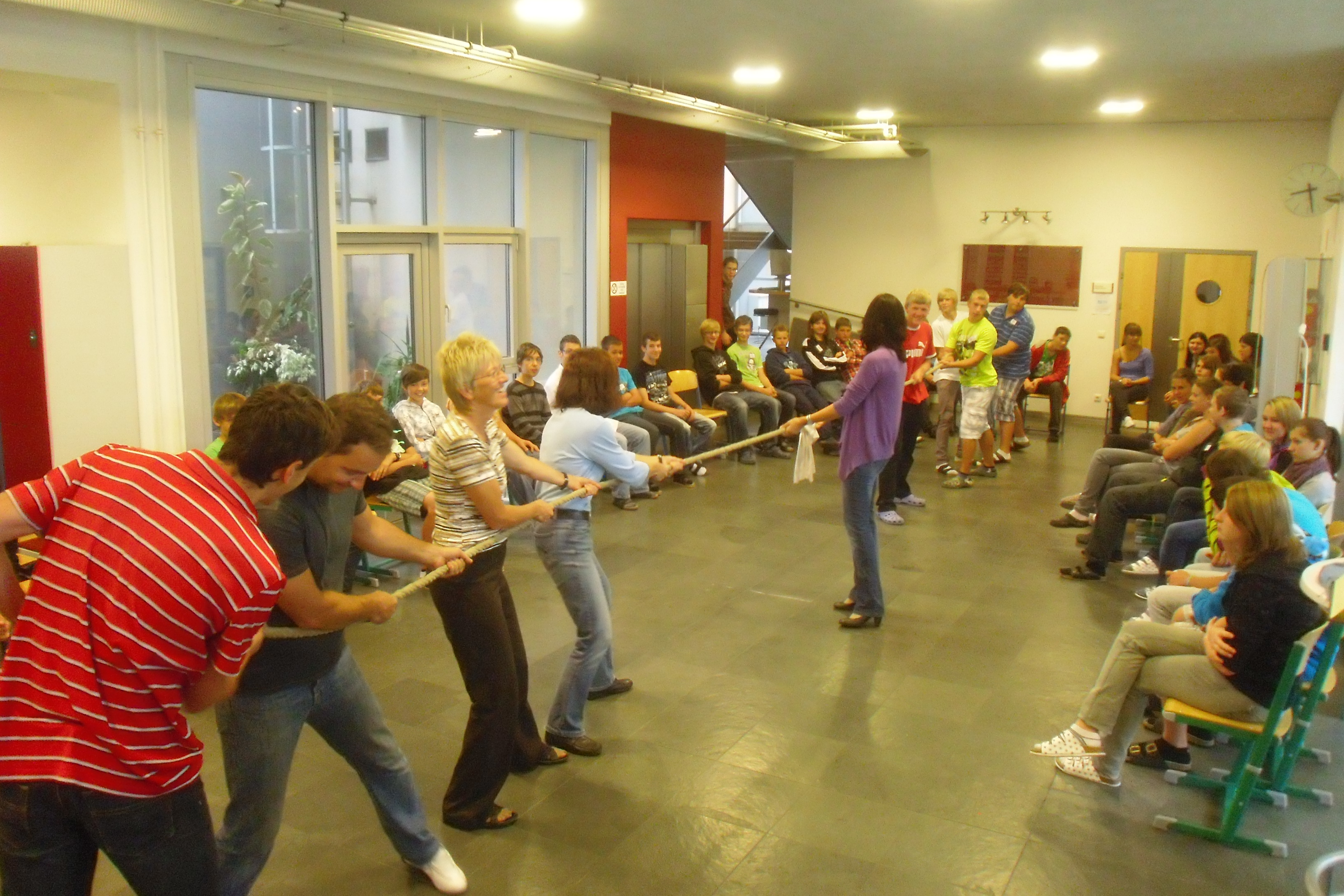 Diesmal „predigte“ das Seil! Beim Seilziehen wurden die Kräfte gemessen und dabei festgestellt, dass gegeneinander ziehen anstrengend und demotivierend ist. Miteinander an einem Strang zu ziehen ist nicht leichter aber effektiver und auch christlicher!