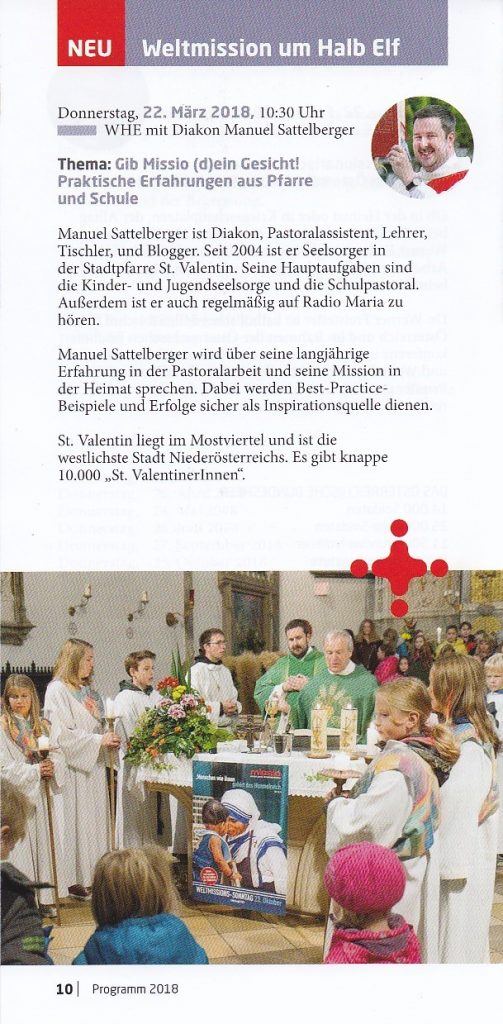 Im Anschluss an den Vortrag, durfte ich missio-Nationaldirektor Pater Karl Wallner, bei der Heiligen Messe in der missio-Kapelle assistieren und predigen! Dieser Gottesdienst wurde von K-TV sogar live übertragen! Meinen Vortrag können alle Interessierten am Samstag, 28. April 2018 um 15 Uhr auf Radio-Maria nachhören. Gerne sende ich auf Wunsch auch mein schriftliches Manuskript zu.