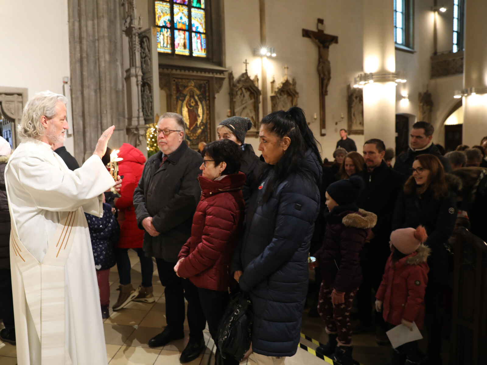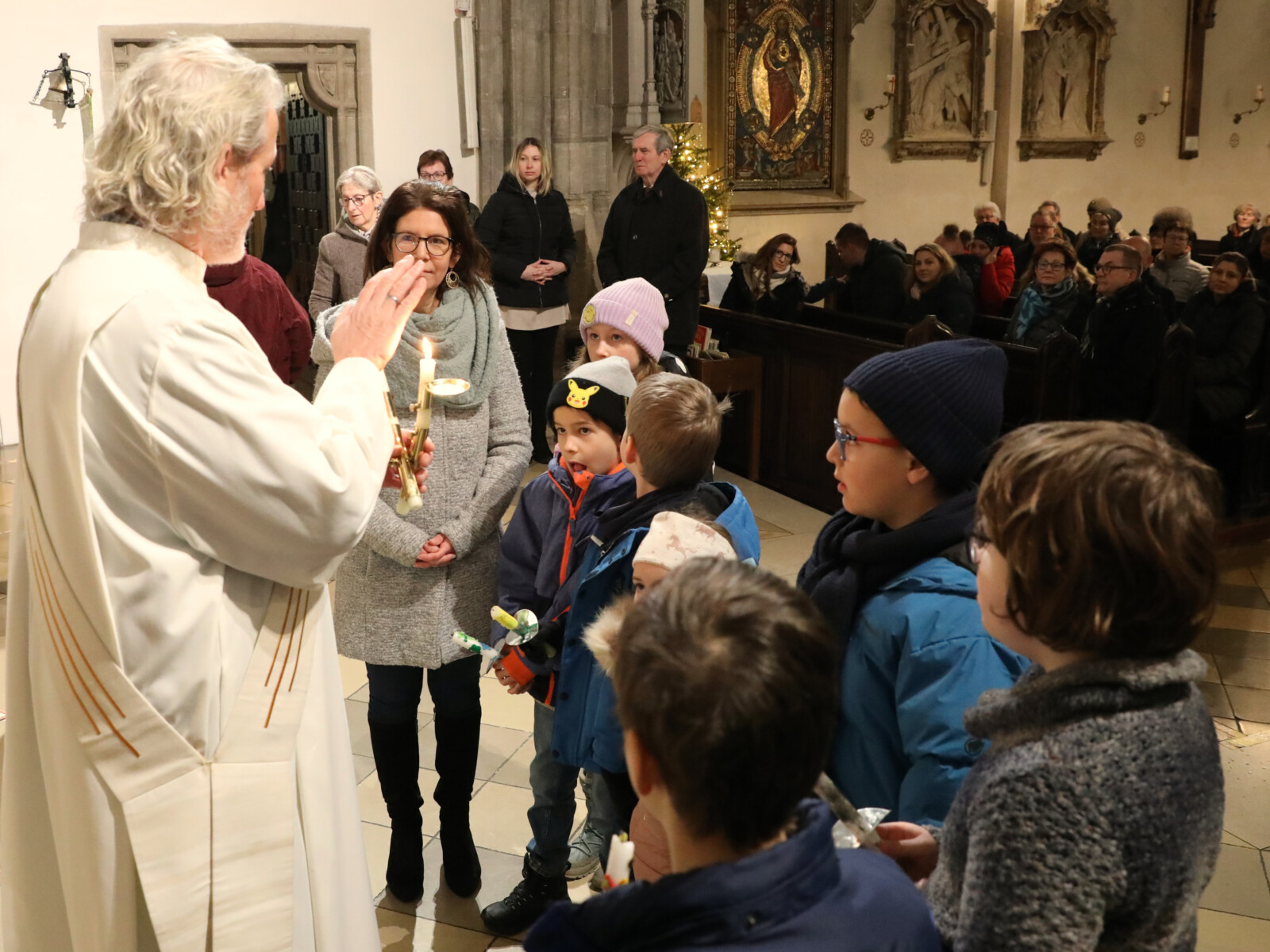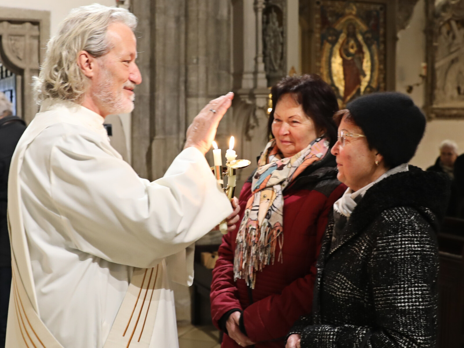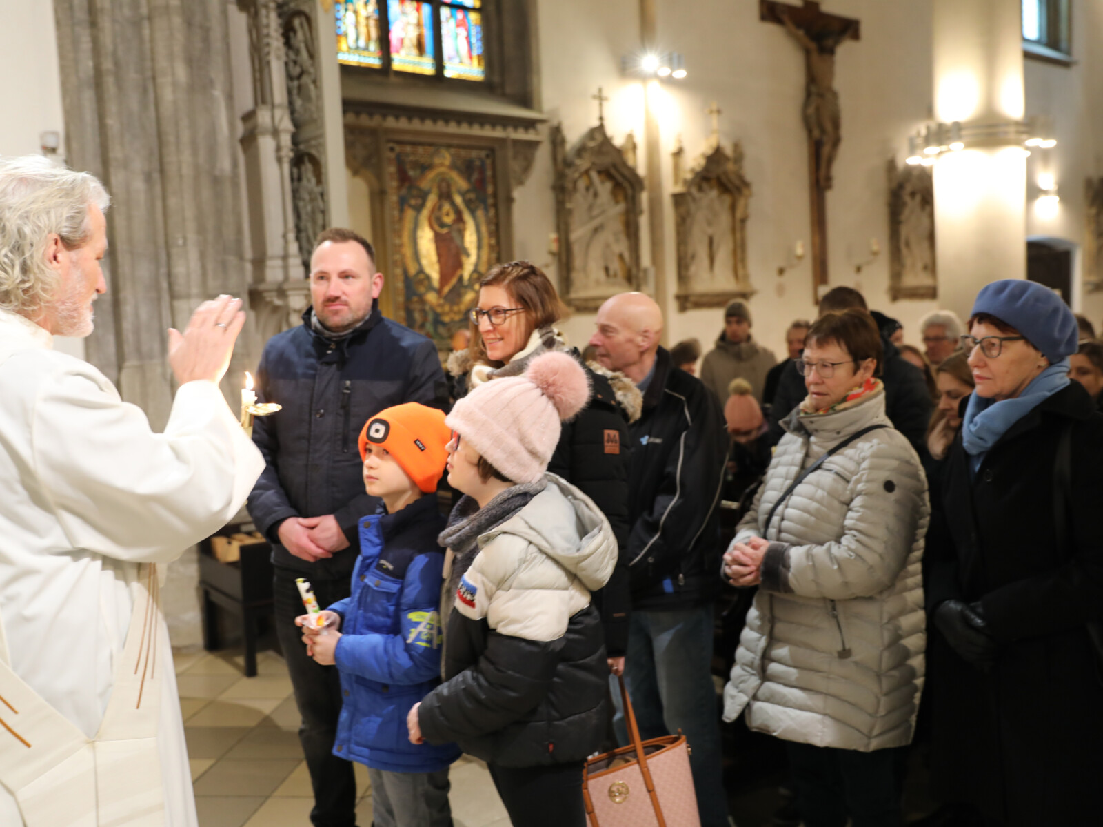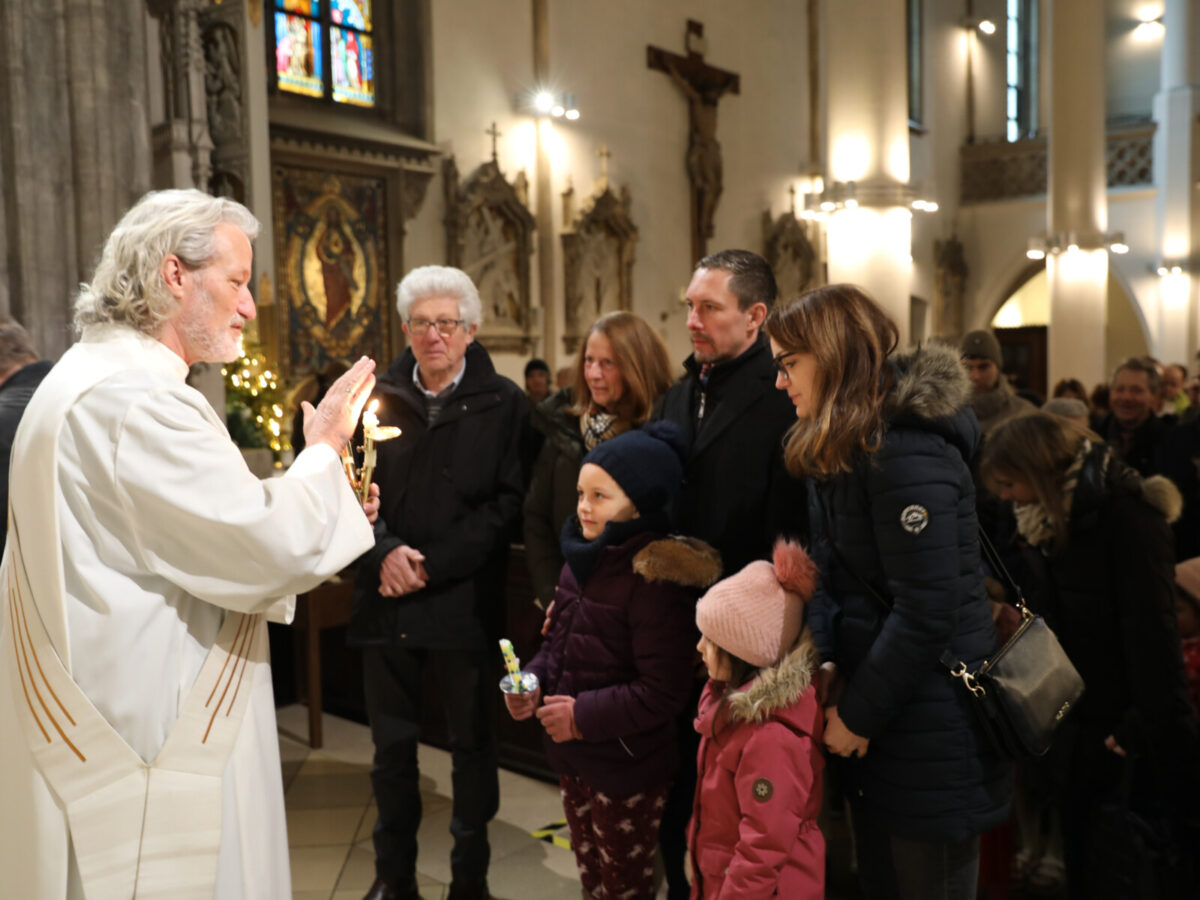 Im Anschluss an den Wortgottesdienst spendete Diakon Christian Muigg den zahlreichen Gottesdienstbesuchern mit geweihten gekreuzten Kerzen den Blasiussegen.