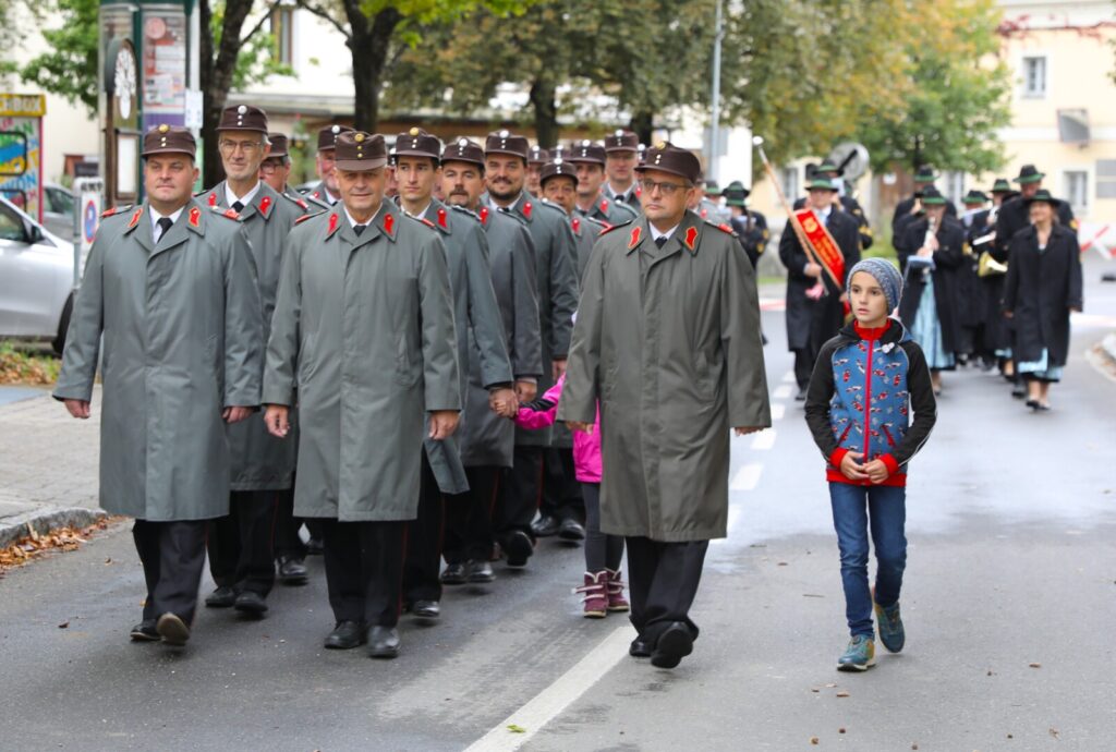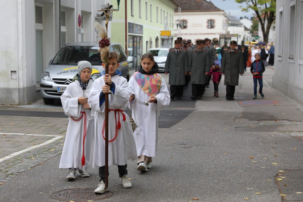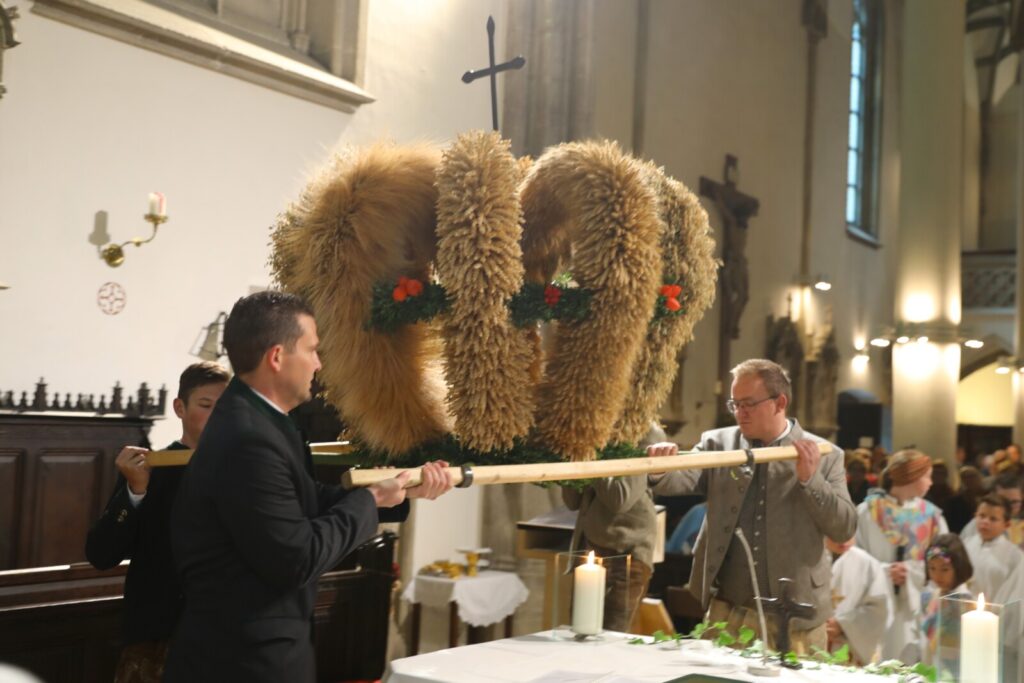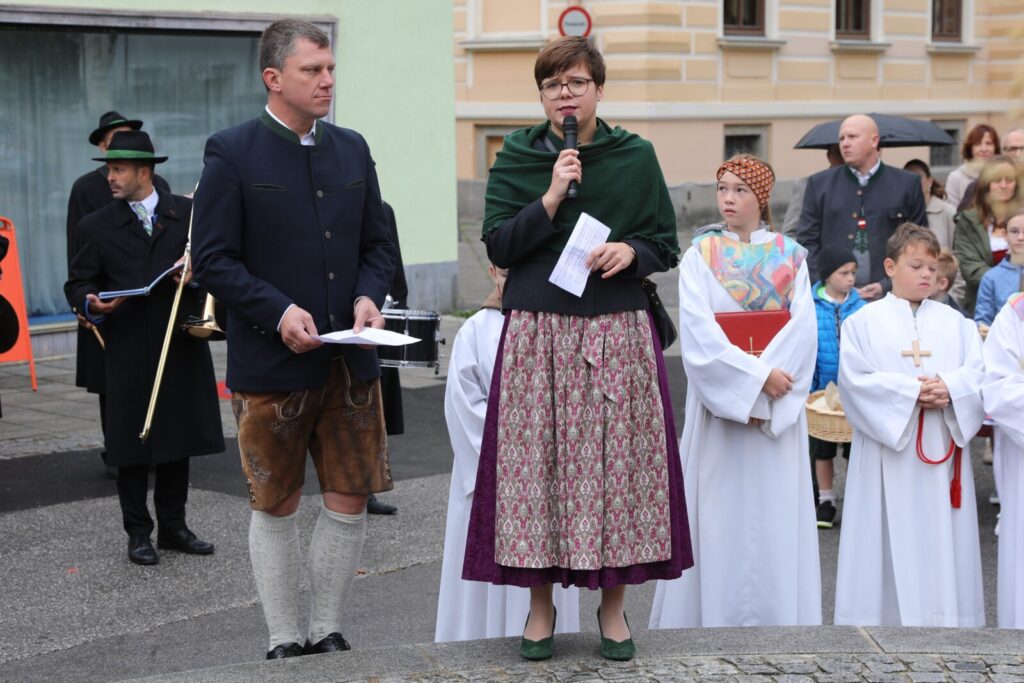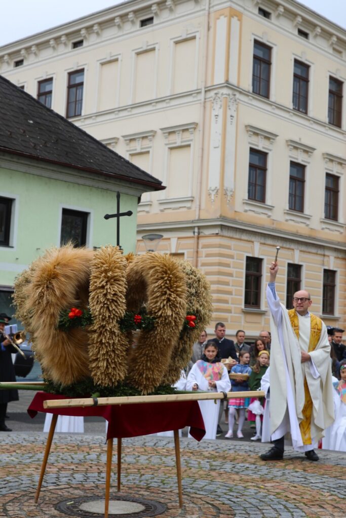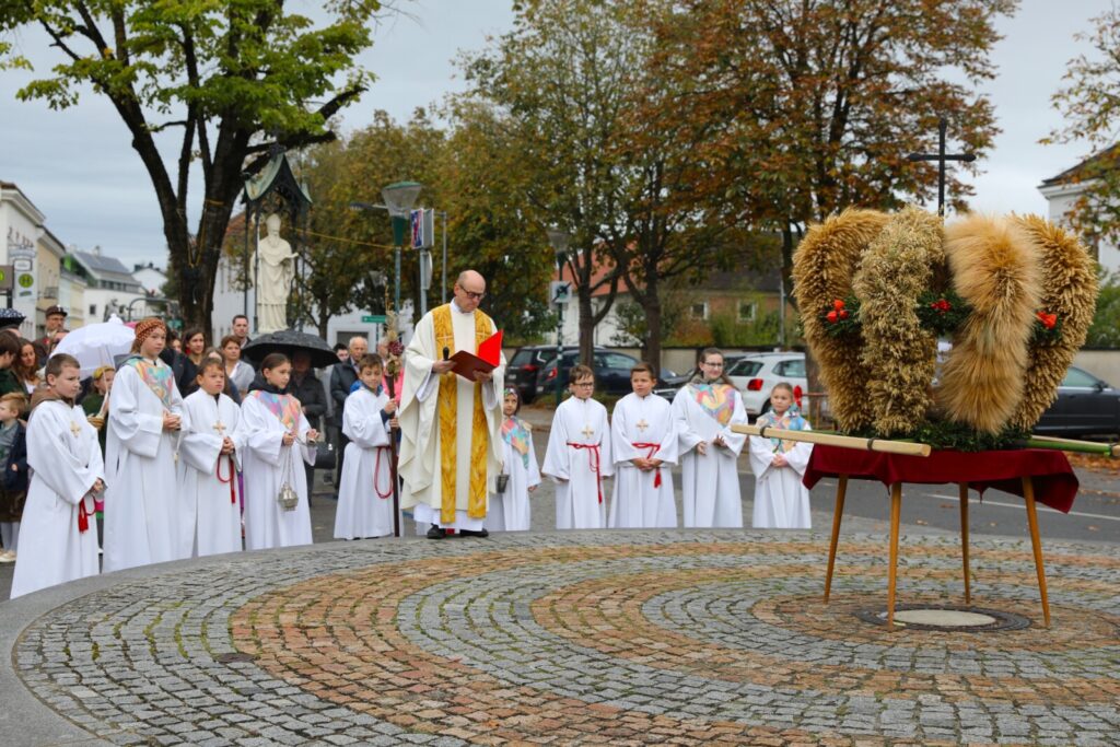 Nach der feierlichen Segnung der Erntekrone durch Pfarrer Dr. Grill setzte sich die Prozession in Bewegung: die Stadtkapelle, die Feuerwehr, Mitglieder der Pfarrgemeinde und des Pfarrkirchenrats sowie die Goldhaubenfrauen zogen gemeinsam in die Kirche ein. Dieser festliche Einzug verlieh dem Gottesdienst eine besondere Atmosphäre.