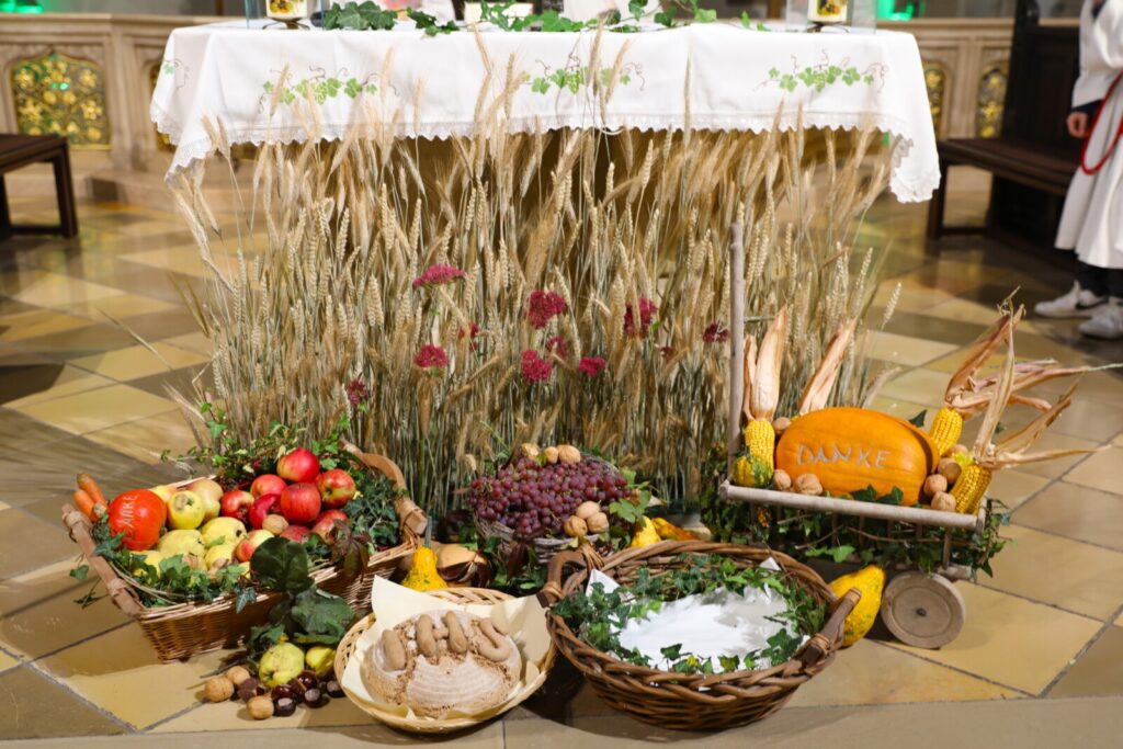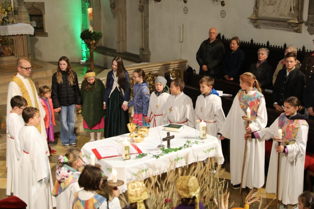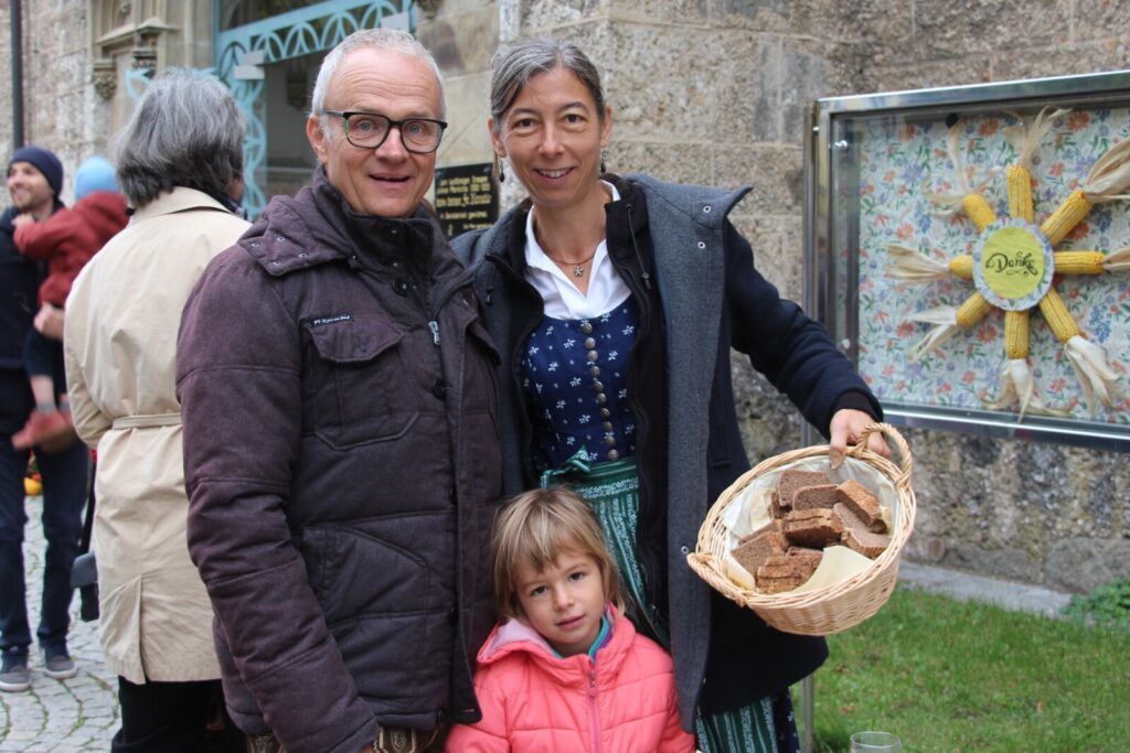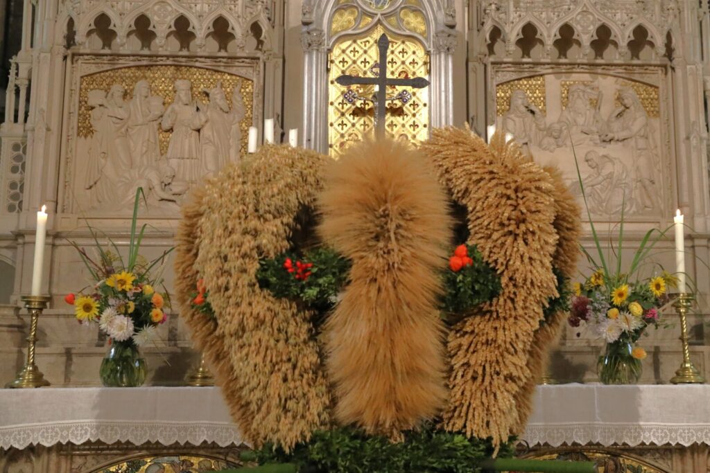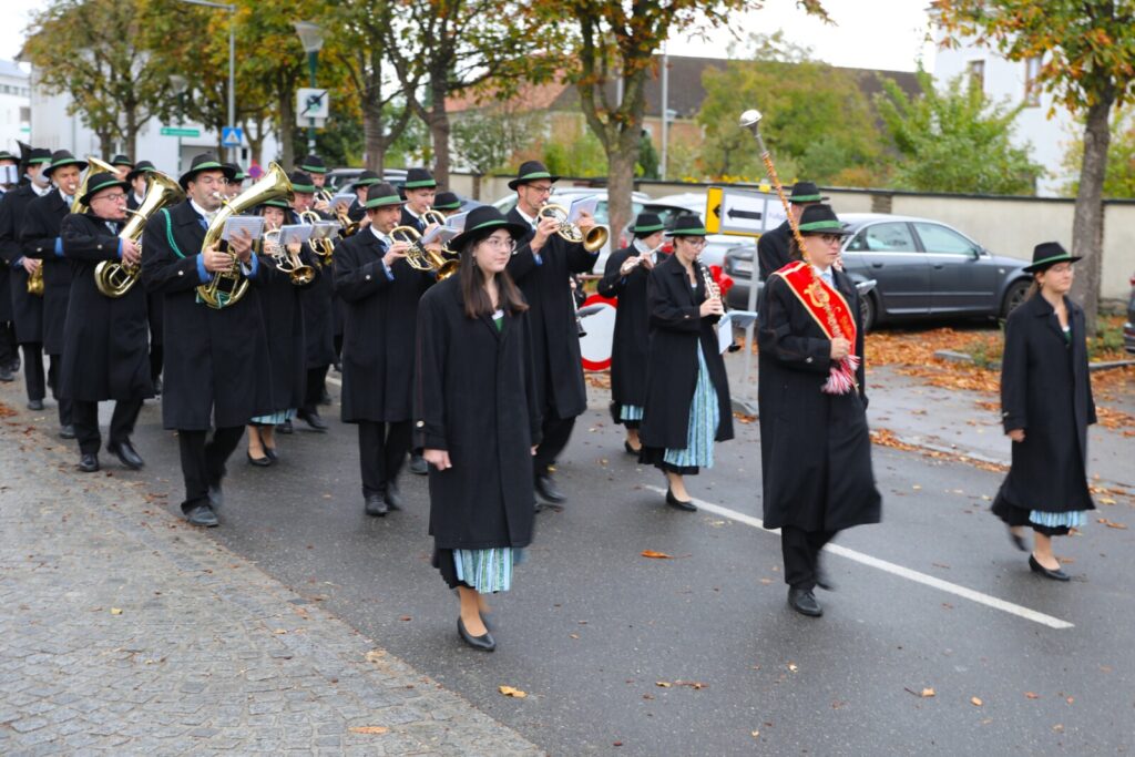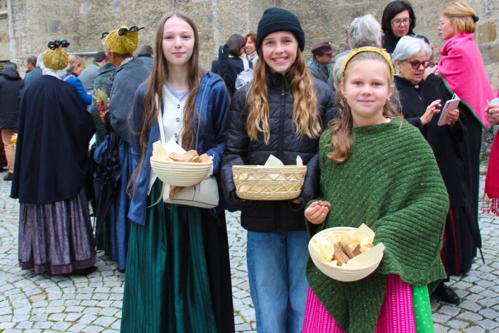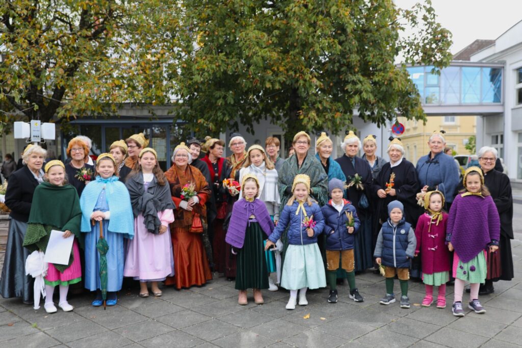 Nach der feierlichen Segnung der Erntekrone durch Pfarrer Dr. Grill setzte sich die Prozession in Bewegung: die Stadtkapelle, die Feuerwehr, Mitglieder der Pfarrgemeinde und des Pfarrkirchenrats sowie die Goldhaubenfrauen zogen gemeinsam in die Kirche ein. Dieser festliche Einzug verlieh dem Gottesdienst eine besondere Atmosphäre.