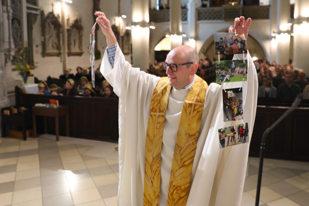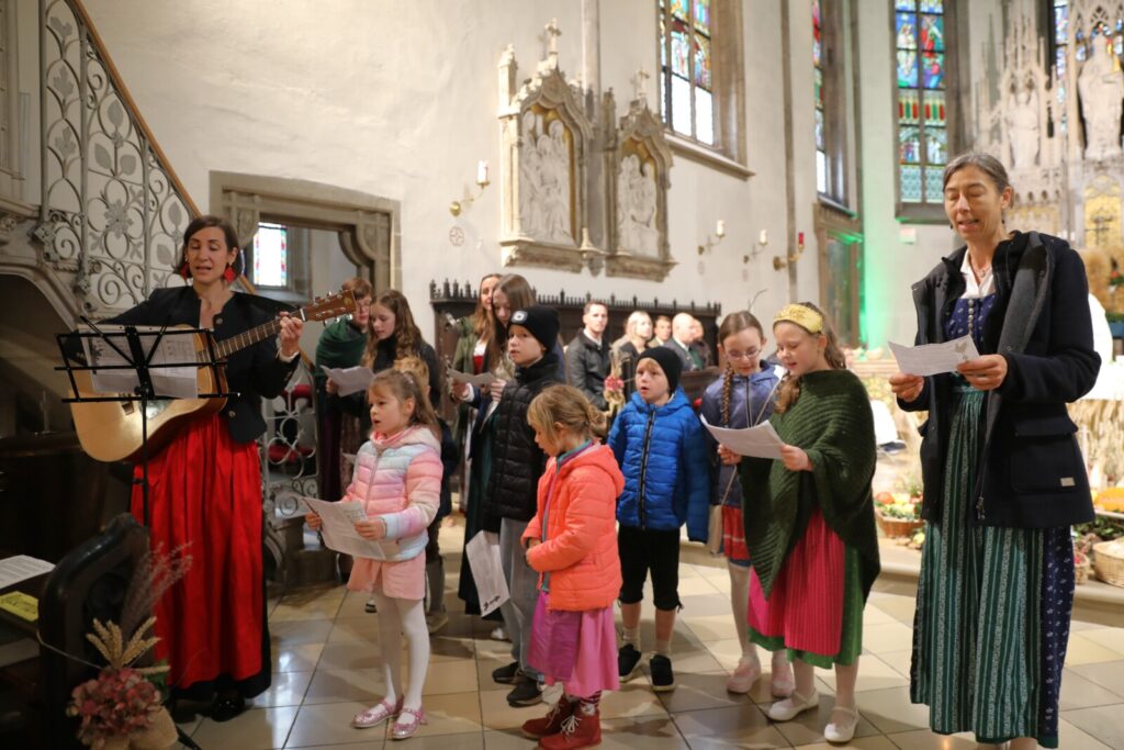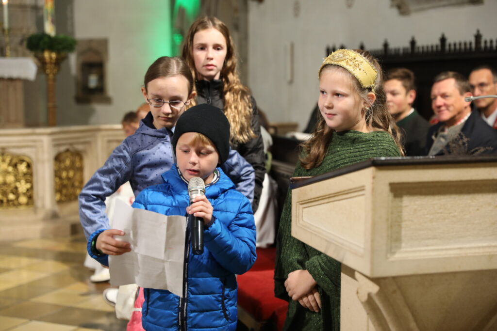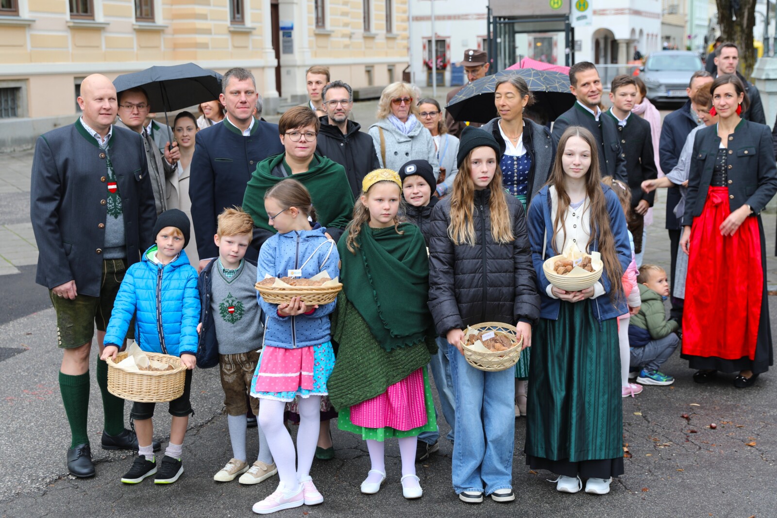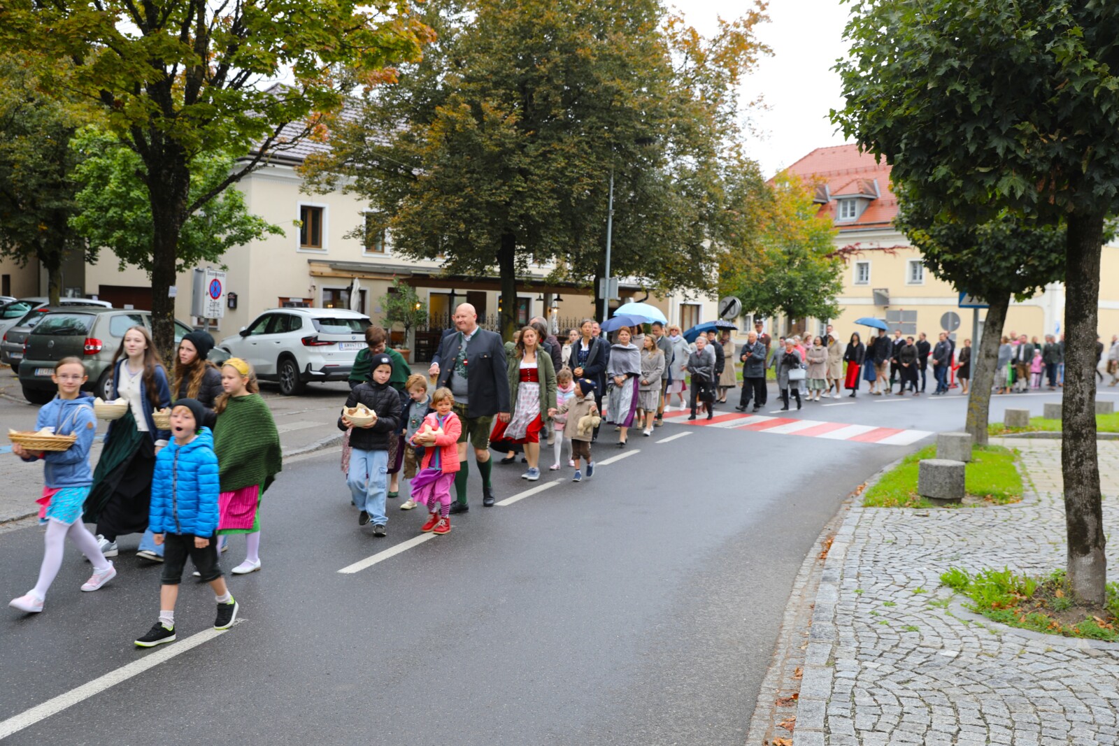 Nach der feierlichen Segnung der Erntekrone durch Pfarrer Dr. Grill setzte sich die Prozession in Bewegung: die Stadtkapelle, die Feuerwehr, Mitglieder der Pfarrgemeinde und des Pfarrkirchenrats sowie die Goldhaubenfrauen zogen gemeinsam in die Kirche ein. Dieser festliche Einzug verlieh dem Gottesdienst eine besondere Atmosphäre.