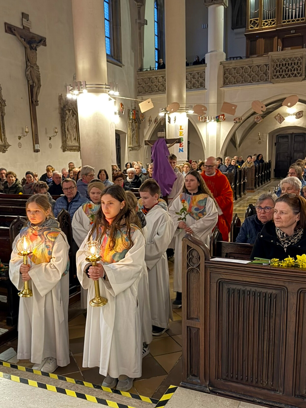 Pfarrer Grill zog gemeinsam mit den Ministranten und dem verhüllten Kreuz in die Kirche ein und stellte es anschließend vor den Altar, wo die Mitfeiernden Blumen zur Kreuzverehrung niederlegen konnten.