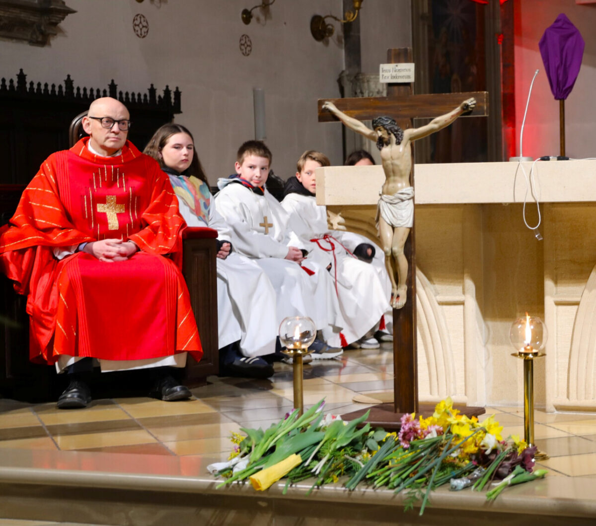 Pfarrer Grill zog gemeinsam mit den Ministranten und dem verhüllten Kreuz in die Kirche ein und stellte es anschließend vor den Altar, wo die Mitfeiernden Blumen zur Kreuzverehrung niederlegen konnten.